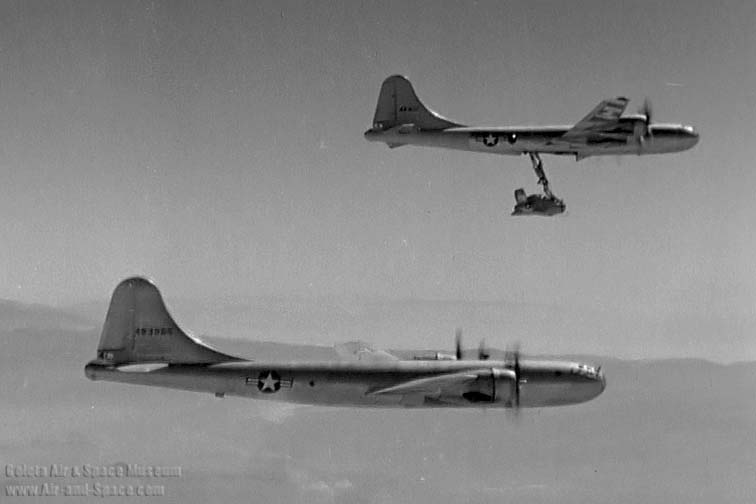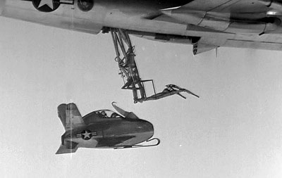 As a production series B-36 was unavailable, all XF-85 flight tests were carried out using a converted EB-29B Superfortress mother ship that had a modified, “cutaway” bomb bay complete with trapeze, front airflow deflector and an array of camera equipment and instrumentation. Since the EB-29B, named Monstro, was smaller than the B-36, the XF-85 would be flight tested, half-exposed. In order to carry the XF-85, a special “loading pit” was dug into the tarmac at South Base, Muroc Field, where all the flight tests originated. On 23 July 1948, the XF-85 flew the first of five captive flights, designed to test whether the EB-29B and its parasite fighter could fly “mated”. The XF-85 was carried in a stowed position, but was sometimes tethered and extended into the airstream with the engine off, for the pilot to gain some feel for the aircraft in flight.